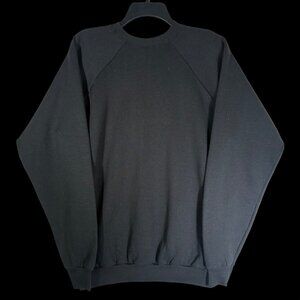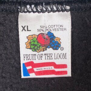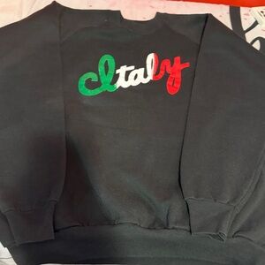 Vintage Fruit of the Loom sweatshirt in black, featuring a vibrant 'Italy' spellout graphic on the front in the colors of the Italian flag (green, white, and red). The sweatshirt is a classic crew neck design with raglan sleeves. The material is a 50% cotton, 50% polyester blend, made in the U.S.A. The garment is in good condition with minor signs of wear consistent with its age. Estimated 46i”chest, 27”i length