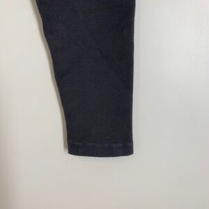 Pair of black seamless leggings, a versatile addition to any wardrobe. These leggings feature a ribbed high waistband for a flattering and secure fit. The seamless construction ensures a smooth silhouette and enhanced comfort. These are perfect for both workouts and casual wear, these leggings offer flexibility and style. There is a small hole in the seam where the band meets the legging.
