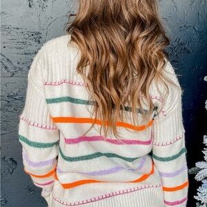 Embrace vibrant style with this colorful striped sweater. Perfect for adding a pop of color to your wardrobe.