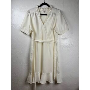 Nanette Lepore cream wrap dress with ruffle neckline and short puff sleeves. A self-tie belt cinches the waist, and a playful ruffle adorns the hemline. This chic dress is perfect for a bridal shower, a garden party, or a sophisticated daytime event.
