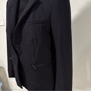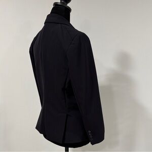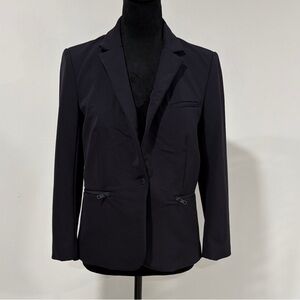 Sophisticated black blazer with tailored fit. Features notched lapels and front pockets.