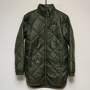 Olive quilted jacket by Patagonia. Ideal for outdoor adventures.