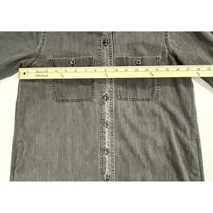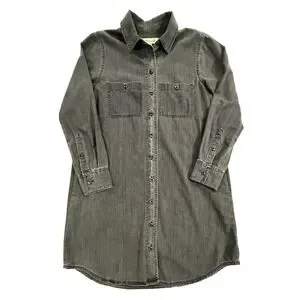 Classic denim shirtdress in a faded black wash offers a versatile, lived-in feel. Crafted from 100% cotton, this long-sleeve piece features a full button-front closure, pointed collar, and dual chest pockets with button flaps. Side seam pockets add functional convenience, while the curved shirttail hem and box pleat at the back yoke provide a relaxed, flattering silhouette.
