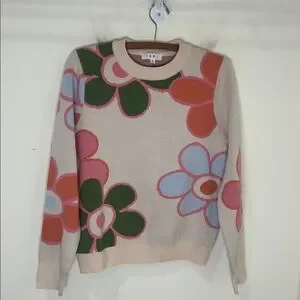 It's a colorful, long-sleeved crewneck top with bold, retro-inspired floral knit design in shades of pink, blue, and green on a cream base.