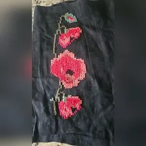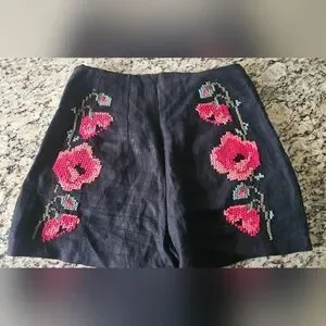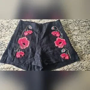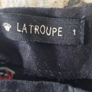 La Troupe black linen-style shorts featuring a distinctive red pink poppy cross-stitch embroidery on both sides. The label in the waistband identifies the brand as LA TROUPE.size 1 small
