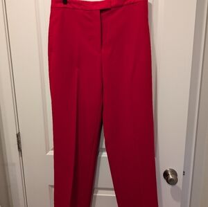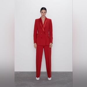 Make a high-fashion statement with this vibrant red tuxedo suit from Zara. This sophisticated set features a sharp, double-breasted blazer and matching high-waisted trousers, both elevated by elegant tonal satin detailing. Perfect for holiday parties, formal events, or a bold "power suit" moment, this ensemble offers a polished, modern silhouette.