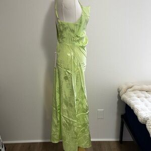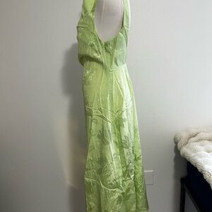 Chic light green satin dress with subtle flower pattern/texture. Perfect for any occasion.