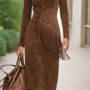 Elegant brown faux suede midi dress featuring stylish fringe detail. Perfect for any occasion.