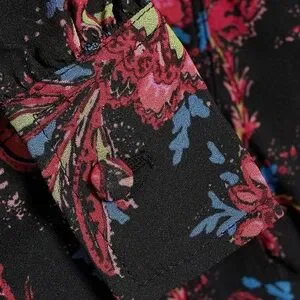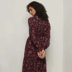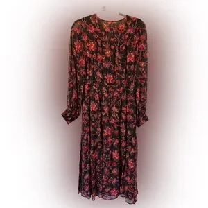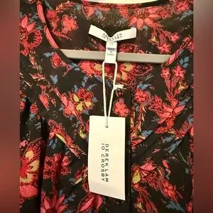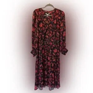 NWT This beautiful dress by Derek Lam 10 Crosby features a gorgeous black floral print and chiffon fabric, Fabric covered buttons down the front to waist and on sleeve cuffs, Lightweight and flowing creates a beautiful silhouette, Midi- Length, Side zipper, Dress is 100% Viscose, Lining is 100% Polyester, Color palette is black background with pink/red/blue/green