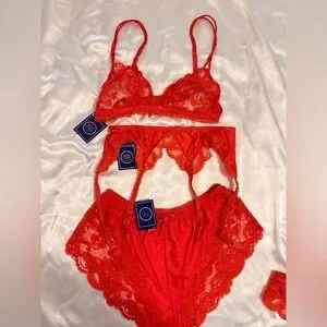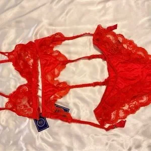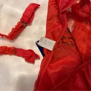 Stunning red lace bra set by La Perla . Features delicate lace and garter details. Perfect for special occasions.