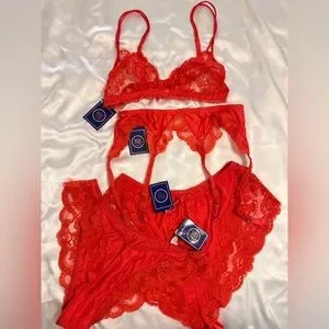 La Perla Vintage Fiery Red Lace Bra Set four pieces .