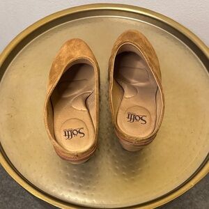 Step out in style with these chic tan suede mules. Perfect for any occasion, these shoes offer both comfort and elegance.