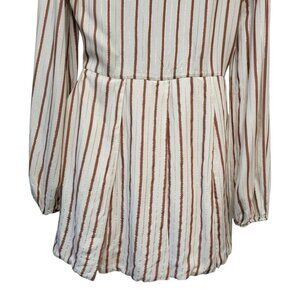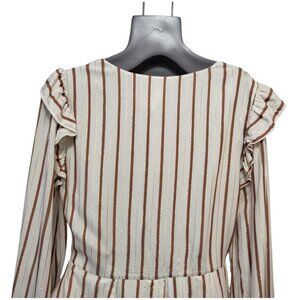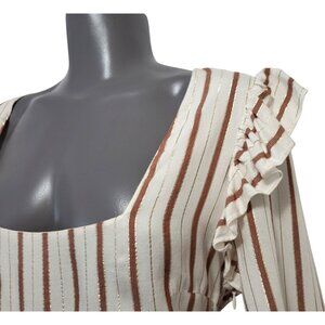 Soft shimmer meets vintage-inspired romance. This Tularosa Blaine mini dress features metallic gold stripe detailing against a cream base, with ruffled shoulder trim and a flattering square neckline. The structured waist flows into a unique split panel overlay skirt — each panel lifts slightly with movement while the base skirt stays close to the body, giving it beautiful dimension without excess volume.