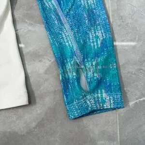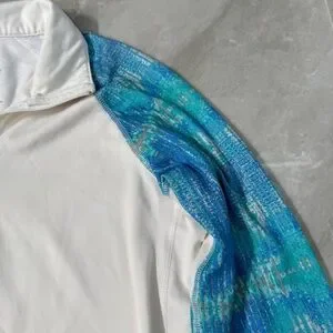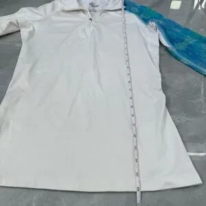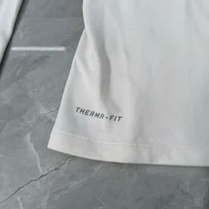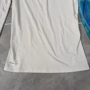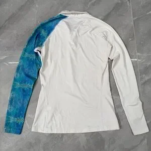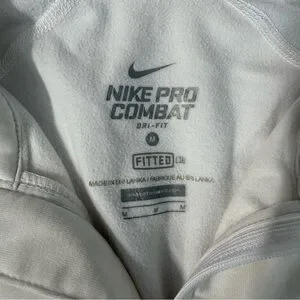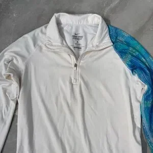 Good condition - Women’s Nike Pro Combat Therma Fit Fitted 1/4th Zip Jacket Pullover Long Sleeve. Has 1/4th zipper closure and thumb holes on ends of sleeves. Colors: white/cream, blues, and gray. Size: M.