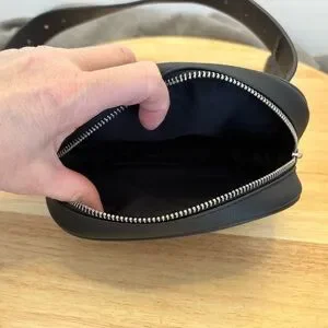 Stylish black quilted belt bag with adjustable belt. Perfect for hands-free convenience.