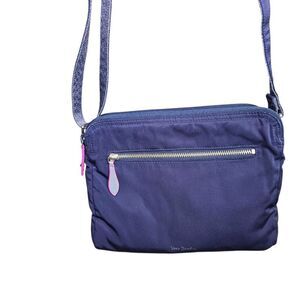 Pretty Vera Bradley Hipster Crossbody Bag in Classic Navy. This bag has an adjustable strap, a front zippered pocket and 2 internal compartments (2 zippered compartments and 1 magnetic closure). Interior also has 1 zippered pocket and 2 slip pockets.