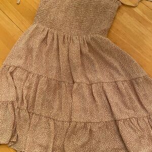 Stylish brown dress with playful patterns. Perfect for casual outings. Comfortable and chic design.