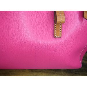 Vibrant Dooney & Bourke Large Shopper Tote. Fuchsia-pink Saffiano leather, multi-colored rainbow chevron lining. Lucca Collection. Beautiful condition. Minor back discoloration from wear (see photo).