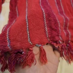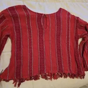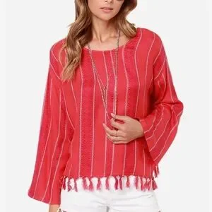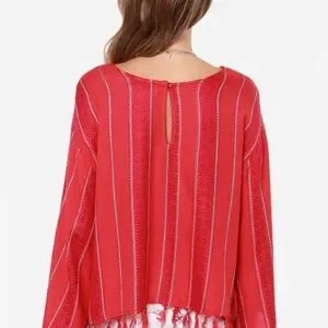 Give your heart what it wants: the Billabong The Heart Seas Striped Red Top! Loosely woven red fabric has slate blue, ivory, and fuchsia interwoven to create decorative vertical stripes down a wide cut top and long sleeves. Beautifully Boho fringe hangs from the hem, while a bit of skin peeks through a back keyhole (with top button closure). Rounded neckline. Unlined. Model is 5'9"and is wearing a size small. Fringe measures 2" long. 100% Rayon. Hand Wash Cold.