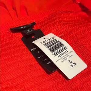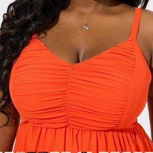 NWT Torrid Babydoll Chiffon Shirred V-Neck Tank. Sleeveless and shirred detail. Stretch level minimum. Adjustable straps. Bust 22”, length 23”. Orange. Size 2 fits 18-20.