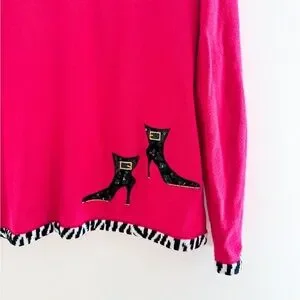Vintage Berek statement cardigan in the most electric hot pink with black embellished high heels and boots throughout. Zebra trim along the collar, button placket, and hem gives it that over-the-top boutique glam vibe. Gold stud accents + stitched grid detailing make it feel very 90s art teacher meets fashion icon.