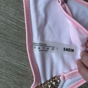Chic light pink bikini with gold chain details. Ideal for summer vibes.