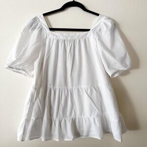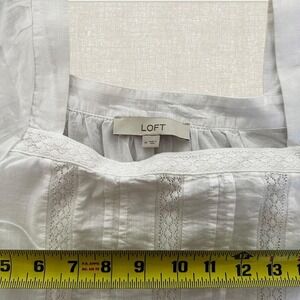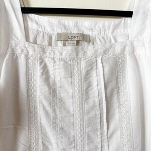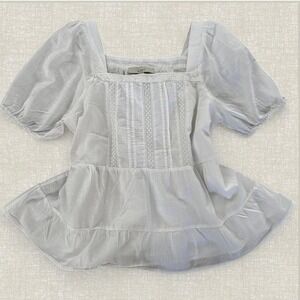 LOFT White Lace Trim Pintuck Square Neck Puff Sleeve Tiered Peplum Blouse Medium