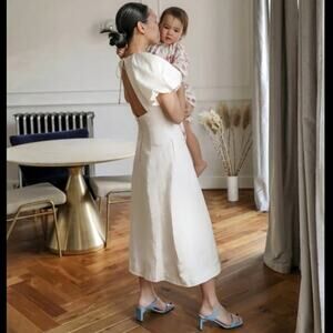 Keywords: classic, casual wedding dress, reception dress, engagement party, bridal, photo shoot, gala, simple, elegant, timeless, modern, midi, puff sleeve, pockets, back zip closure, flattering, breathable linen, off white, designer, luxe, quiet luxury