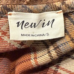 Newin Rust Orange Plaid Hooded Shacket, size Small. This versatile shirt jacket features a warm autumnal plaid pattern in rust orange, brown, and tan. Design details include a lightweight waffle knit hood with drawstring, button-down front, and a chest pocket. The hemline has a stylish frayed, raw-edge finish with a subtle high-low silhouette for a modern touch. Perfect for layering during fall or cool spring days. Features long sleeves with button cuffs and waffle knit trim at the sides. Excellent pre-owned condition.