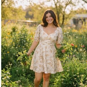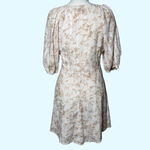 Lucy Paris Floral V-Neck Puff Sleeve Mini Dress Beige Women's Medium