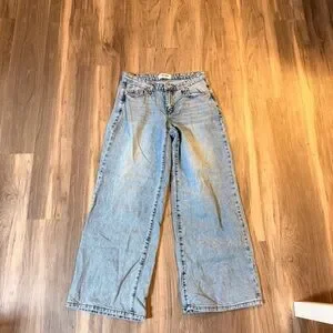 Stylish light blue mid rise jeans with a wide leg design. Perfect for casual wear.