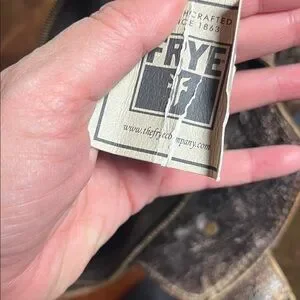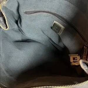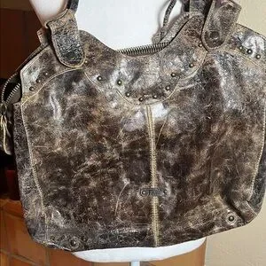 Stylish Frye shoulder bag. Distressed leather design. Studded accents. Dual handles for easy carrying.