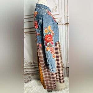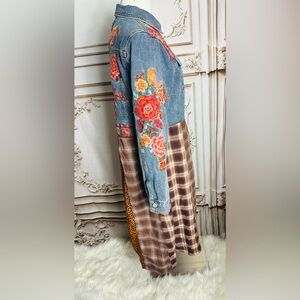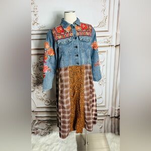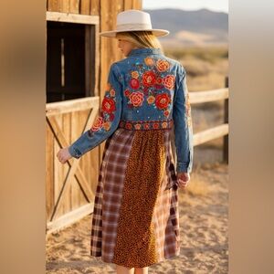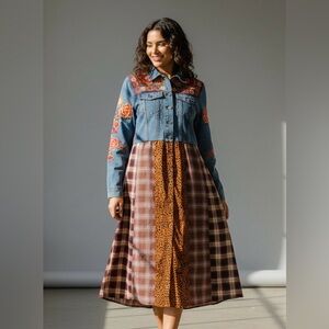 Stylish denim dress with floral patchwork and plaid design. Features a button-down front.