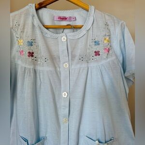 Features delicate floral embroidery on the top and pockets, with a breathable, lightweight cotton fabric that feels incredibly comfortable on the skin.