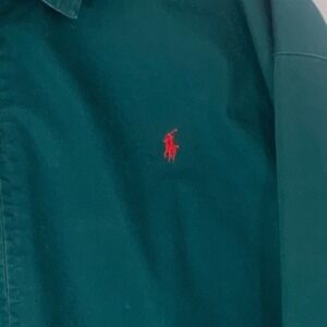 Classic Harrington-style jacket features a rich forest green cotton twill shell with the iconic red pony embroidery on the chest. Designed with a versatile full-zip front and a stylish mock neck collar with a dual-button throat latch, this piece offers a timeless silhouette. The interior is fully lined with a vibrant multi-color plaid pattern in 100% cotton, providing both comfort and a heritage aesthetic. Finished with elasticized cuffs and hem for a secure fit and two slanted welt hand pockets. This jacket is in excellent pre-owned condition.