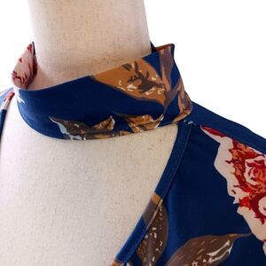 Oversized High Low Hemline Balloon Sleeves 80's Vintage Floral Multi Color Print Navy Blue Feminine Elastic Wrists Pearly White Buttons