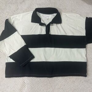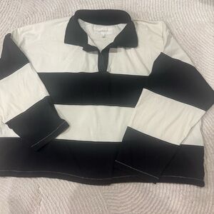 Woman stylish black and white striped top. Features a classic collar and long sleeves. Perfect for casual wear.