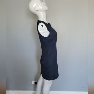 Shift dress with navy twill type fabric on one side and stretchy black fabric on the other. Asymmetrical design where the two colors meet on the front and back.