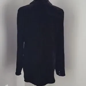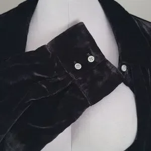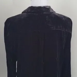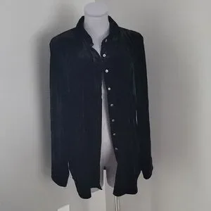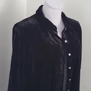 Stunning, classic black velvet button-down shirt from Talbots. It's a versatile piece that can easily be dressed up or down. The soft stretch velvet fabric gives it a luxurious feel, perfect for a chic evening out or adding a touch of elegance to a casual look. Hip length.