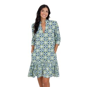 Olivia James The Label cotton shift dress showcases a vibrant geometric tile print in shades of blue and green. Designed with a split neckline and a ruffled stand collar, this piece features 3/4 length sleeves with button cuffs and a playful tiered ruffle hem. The lightweight, breathable fabric and functional side pockets make it a versatile choice for warm-weather styling