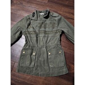 Keywords: Miss Me Girls L green military jacket, embroidered beaded utility twill coat, kids casual fall spring outerwear