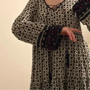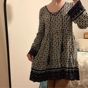 Step out in style with this bohemian long sleeve dress. Featuring a charming floral pattern in black and cream, it's perfect for any casual outing.