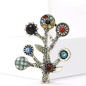 The tree is adorned with various colorful gemstone accents, acting as flowers or leaves, adding a vibrant touch. It's a versatile accessory, perfect for pinning on dresses, suits, coats, hats, scarves, or bags. The intricate design makes it an ideal accessory for daily wear, parties, or as a thoughtful gift.