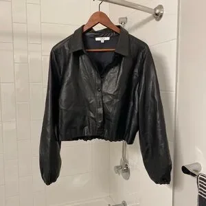 Chic cropped leather jacket by Cleo. Features a button-up front and long sleeves. Perfect for layering. The tag reads XXL petite, but it works perfectly as an oversized cropped jacket. I wore it this weekend and I typically wear a size 6.
