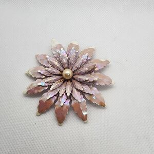 Vintage 1960's pink and white iridescent snowflake flower brooch with a faux pearl in the middle.