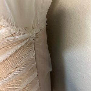 Chic ruched dress in white with sheer long sleeves. Features a stylish front tie detail. (tiny hole under the right arm, doesn’t affect wearability) great condition