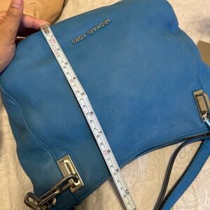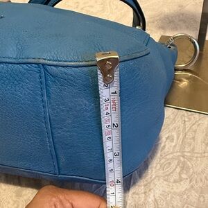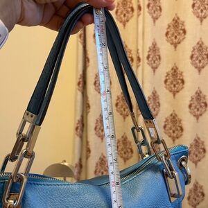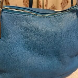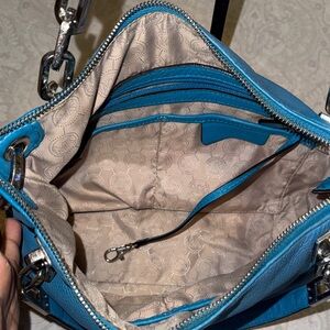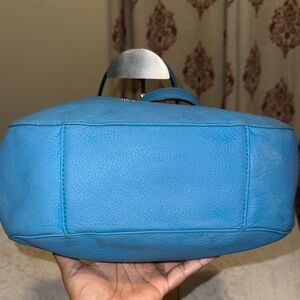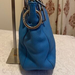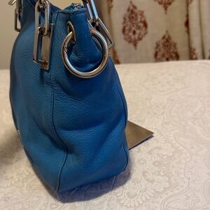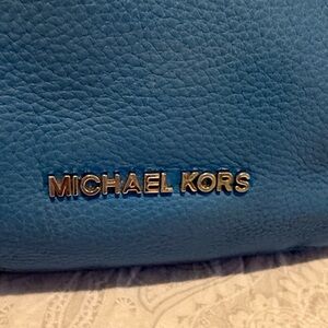 Stylish Michael Kors shoulder bag in vibrant blue. Features sleek design and silver accents. Ideal for daily use.has some discoloration may be need to leather condition . The crossbody strap is missing