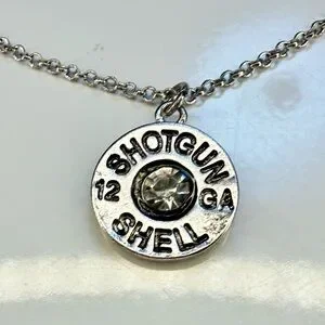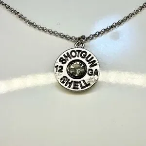 Unique silver-tone necklace featuring a faux 12 gauge shotgun shell charm with a clear crystal center. A fun Western / country aesthetic piece that pairs perfectly with denim, boots, and graphic tees.