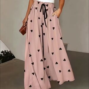 Wide-Leg Pants with a Heart/Love Print. Featuring a High-Waisted Elastic Waistband And Decorative Drawstring Design. These Stylish And Sweet Casual Pants Are Perfect for Women, Offering Elegance for Autumn And Winter. Chic and stylish pink maxi skirt with a charming heart print. Perfect for any occasion.