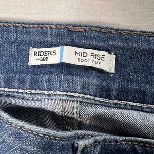 Riders By Lee midrise bootcut jeans in women's size 12P. These jeans feature embroidered pockets, a medium wash denim fabric, and a regular fit. They have a zip and button closure, a 5-pocket design, and come in a classic blue color. The jeans are machine washable and have a 28-inch inseam, making them a stylish and comfortable option for petite women.